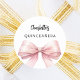 A white background. Decorated with a large pink bow. Personalize and add a name. Black handwritten style script.