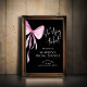 This stunning welcome poster features a sleek black backdrop, creating a bold and contemporary foundation. A beautiful blush pink bow takes a prominent place, its delicate strokes symbolizing the joyous union and adding a vibrant pop of colour against the black. The celebratory phrase "She's tying the knot" is gracefully incorporated at the top in white script, perfectly setting the theme. Just below, the words "WELCOME TO" appear in a charming small white script, warmly inviting guests. The Guest of Honour's Name is prominently displayed in white script, ensuring everyone knows who the celebration is for. The words "Bridal Shower" are elegantly presented in a refined white script, and the date of the event is also included in white script, anchoring the occasion. To add an extra layer of excitement, a personalized final countdown is prominently featured in white script, such as "[X] days until she ties the KNOT," building anticipation for the wedding day. The overall aesthetic is one of bold romance, modern love, and striking detail, making this poster a sophisticated and interactive focal point for your celebration.