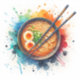 Ai watercolor illustration of a bowl of Ramen noodles, a boiled egg, green onions and chopsticks.