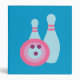 This retro bowling illustration features a pink, purple and blue bowling ball with fun circles on it in front of two bright blue pins with pink stripes! This vintage inspired art is kitschy, original and would make a great gift for a bowler!