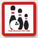 Bowling ball and pins custom beverage coaster that displays a minimalist icon of three black bowling pins with red stripes, a ball and your text on white background with red border.