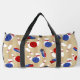 Tote your gear to the bowling alley in style with this personalized duffel bag. It's patterned with illustrations of bowling balls, bowling pins, and bowling shoes in red, white and blue against a tan background. On one side is a spot to add a name in blue script lettering.