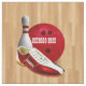 Bowling Ball Shoe And Pin With Your Custom Name in red and white colours on wooden bowling alley floor. You can personalize it with your own name, team or your bowling name club