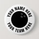 Bowling buttons with custom team names, Make your own round badge with name and team name. Great for party, sports event, club, tournament and more. Black bowling ball with personalized text.