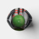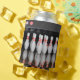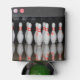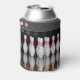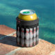 A can cooler featuring bowling pins all around and a green bowling ball smashing through pins on the bottom.
