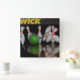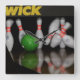 A square clock with a picture of a bowling ball crashing into pins.