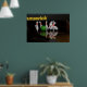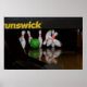 A poster featuring a photo of a bowling ball knocking down bowling pins.