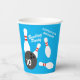 Bowling theme kid's Birthday party disposable Paper Cups. Fun party supplies for celebration at home or the bowling alley. Also great for other occasions. Add your own custom text. Bowling pins and ball strike design. Blue or custom background colour.