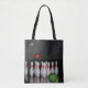 A tote bag featuring a photo of bowling pins and a bowling ball.