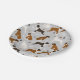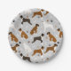 Cute Boxer dogs sits and stands with brindle, white and fawn coats with scattered dog bones and pawprints pattern.