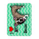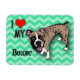 This modern refrigerator magnet design features an illustration of a Boxer with a green monochromatic chevron pattern background. Unique text reads: "I love (heart) my Boxer". We have several colours available in this unique design and will be adding new breeds each month!