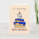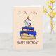 There is a number 8 candle filled with colorful candies on the top of a blue icing cake on the front of this cute card. Perfect to send any special boy celebrating his 9th birthday.