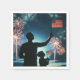 Silhouetted figures of an adult and young boy hold American flags, gazing at a sky lit up with vibrant fireworks