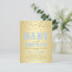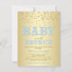 Boy baby shower brunch invitations with sweet whimsical baby brunch words on a gold glitter background. This baby blue and gold baby shower brunch invitation is easily customized for your event by simply adding your details in the font style and colour and wording of your choice. This is a printed design with no real glitter.