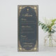 This elegant vintage baptism menu with a vintage air, recommended for a boy's christening, has on both sides a golden baroque decorative frame on a dark blue background. The name, the title "Menu" and the subtitles are written in an elegant calligraphic script. All text can be personalized and has a golden colour similar to the golden frame. There is a (faux) gold cross above the text.