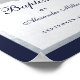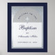 A simple but modern baptism design. On a navy blue rectangular background, it has a faux silver foil arch that has inside navy blue text on white background. The word Baptism and the name are written in an elegant calligraphic script; the first line is arched text.