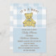 This blue baby shower invitation features a sweet boy bear wearing a blue bow with a blue and white buffalo check pattern behind. Text above reads "It's a Boy!" The bottom section of the card is blue with sample party details for you to personalize. Back of invitation is decorated with matching blue and white buffalo check.