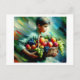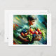 A young boy holds a large basket brimming with colorful fruits, including grapes and apples. The background features dynamic strokes of vibrant colors, highlighting the boy's focused expression.