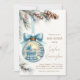 Celebrate the upcoming arrival of your baby boy with this stunning winter wonderland-themed baby shower invitation! Featuring an adorable blue baby crib and rocking chair tucked inside a glowing holiday ornament, this design creates a magical and cozy winter atmosphere. Soft pine branches, pine cones, and a blue ribbon add to the festive charm, making it the perfect invitation for a winter baby shower.