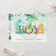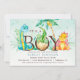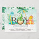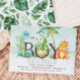 Dinosaur themed boy baby shower invitation featuring three dinosaurs. Back of invite has a tropical greenery pattern.