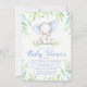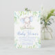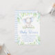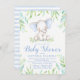 Boys elephant baby shower invitations with sweet watercolor baby elephant on a palm leaf and blue watercolor stripe background. These boy elephant baby shower invitations are easily customized for your event by simply adding your event details in the font style and wording you prefer.