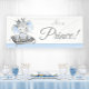 Elephant prince baby shower banner with adorable elephant prince on a blue polka dot background. This boy elephant baby shower banner is easily customized with the text of your choice in the font style you prefer.