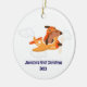 Brighten your holiday decor with this cute Christmas ornament showcasing a funny cartoon dog pilot soaring through the skies in an airplane, surrounded by fluffy white clouds. Customize it with a name or initials, and year for a unique touch. Crafted with love, this ornament is the perfect aviation themed present for pilots, aviation enthusiasts, or frequent travelers celebrating their first Christmas or any festive season. Add a personalized flair to your tree or give it to someone special!