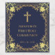 This elegant navy and gold religious design with a vintage air, recommended for a boy, has an ornate faux gold foil frame with elegant baroque decorations on a navy blue background. Above the text there is a religious cross in faux gold foil. The occasion is also in faux gold; the rest of the text has a golden colour similar to the faux gold frame.