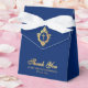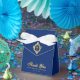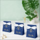 An elegant royal blue and gold boy first communion favour box. On the flap, it has vintage crest with a cross in it, both from faux gold foil.