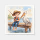 A young boy in overalls and a straw hat sits on a wooden dock holding a fishing pole with a hopeful pelican looking on
