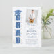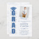 A background of engineering drafting designs, with the same engineer drafting paper effect over the bold letters spelling the word GRAD in blue, decorate this modern, elegant and classy boy high school graduation party or celebration photo invitation for a boy who loves technology, engineering and all things geeky. Customize every line of text, to include the graduation ceremony and afterwards party, or only the party, an open-house celebration... etc. Template for one photo.