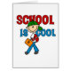 Cute back to school stick figure design with a stick figure boy wearing a backpack and colourful red and blue text that reads "School is Cool"!