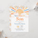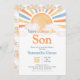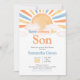 Brighten up your baby boy shower with this adorable Boy Sunshine Baby Shower Invitation. Brighten up your baby boy shower with this adorable "Here Comes the Son" baby shower invitation! Featuring a watercolor sun with orange, blue, and yellow rays, soft white clouds, and playful boho vibes, it’s perfect for a sunny, gender-specific celebration. Easily customize the text for a cheerful and modern "Sonshine" themed event your guests will love! BBS1007