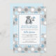 This cute baby shower invitation for a boy features a sweet teddy bear holding balloons with a polka dot background in blue and grey. The backside design is blue and white stripes that match the front. All text is editable so you can personalize this design for your own unique needs.