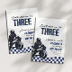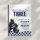 Can't catch me, I'm three! Celebrate your sons 3rd birthday with our blue, black and white speedster third birthday invitation.