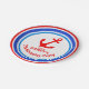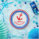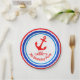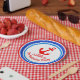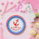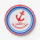 Bold anchor themed birthday personalized disposable paper plates, featuring your own name a red anchor graphic design. Personalize with your own birthday boys name and age. Currently reads Ahoy Danny's 7th Birthday Party. Ideal for a kids nautical birthday. Designed by Sarah Trett.