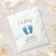 This cute Boy's Baby Shower favour bag is decorated with modern typography and cute baby's feet in blue glitter.