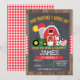 This boy's cute barnyard or farmyard birthday party invitation features a red barn, tractor, pig, lamb and a cow. The design consists of a chalkboard style frame and a plaid and wood image background. This is a cute invitation and way to invite your child's friends to his barnyard theme birthday party. This boy's farmyard or barnyard birthday party invitation is ready to be personalized.