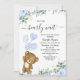 Cute we can bearly wait themed boy's baby shower invitation featuring a bear and various pattern balloons as well as some floral arrangements featuring blue roses and eucalyptus foliage.