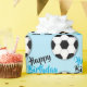 A pale blue background has white and black soccer balls and the words "happy birthday" plus the birthday boys age on it