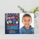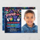 Bowling birthday party invitation for boys. Rainbow glow colours. Includes a photo