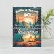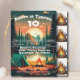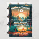 This camping birthday invitation is set against a backdrop of towering trees and majestic mountains with a serene pond in the light of a setting sun. The image captures the tranquillity of the great outdoors, with shades of green and blue blending seamlessly to create a peaceful and inviting atmosphere. A bold, eye-catching font announces the celebration, inviting guests to join in on a birthday adventure under the stars. With its striking imagery and elegant design, this invitation promises an unforgettable experience surrounded by nature's majesty.