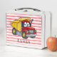 This modern design features a cute red and yellow cartoon dump truck on an aesthetic red and white striped background. The back of this lunch box features the same red and white striped pattern as the front. Personalize with a name or initials. #lunchbox #lunchboxes #lunch #boy #backtoschool #schoolsupplies #school #cute