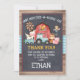 This boy's cute barnyard or farmyard birthday thank you card features a red barn, tractor, pig, horse and a cow. The design consists of a chalkboard style frame and a blue plaid and wood image background. This is a cute way to thank your little boy's guests for coming to his barnyard theme birthday party.