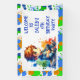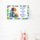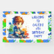 Personalized welcome to our birthday party banner. Cute little boy playing video games. Blue, green and orange paint splatter background.