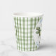 Party like a dinosaur themed birthday paper cup featuring a large dino, balloons, party hat, and some blue text. This dino themed birthday paper cup also features a green plaid pattern and can be used for any age.
