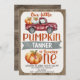 Cute little pumpkin 1st birthday invitation for a little boy featuring a truck and various pumpkins on a white and wood-like background. The design also includes a banner and un-editable text. This is a cute way to invite guests to you little boy's October first birthday party.