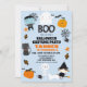 Cute boys Halloween birthday party invitation featuring various cute Halloween character in gray, black and orange. This design is ideal to set the scene for Halloween birthday costume party.
