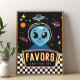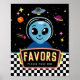 This Out of This World favor sign features a cute blue alien with planets, stars, and a UFO in a fun retro neon space style. Perfect for an alien, outer space, or galaxy kids party favor table.