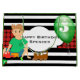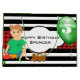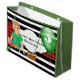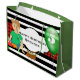A cool gift bag with bold and modern black & white stripes, a cool green & black gingham pattern, boys playing and customization on both sides.